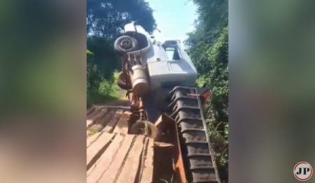 Caminhão caçamba cai de ponte e fica parcialmente submerso em córrego na zona rural de Porangatu