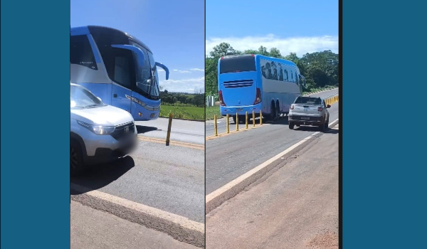 As imagens captadas mostram situações de extrema imprudência. Em um ponto do trevo sul, onde a faixa é contínua e a ultrapassagem é totalmente proibida, um ônibus — possivelmente de turismo — realizou uma manobra irregular, colocando em risco não apenas os passageiros, mas também outros usuários da rodovia. A atitude poderia ter resultado em um grave acidente.