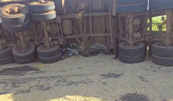 A rodovia está totalmente interditada nos dois sentidos para permitir o trabalho da perícia, a retirada do corpo, o destombamento da carreta e a limpeza completa da pista, que ficou coberta por grãos de soja.