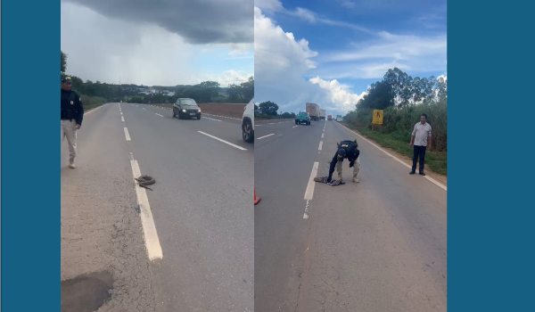 Diante da situação, os policiais realizaram a sinalização do local para reduzir o risco de atropelamento. Em seguida, a equipe verificou que a cobra não apresentava ferimentos.