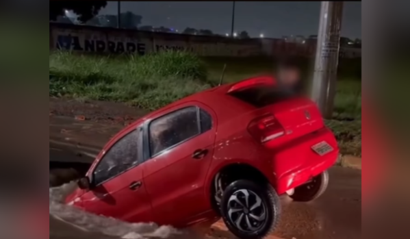 Imagens impressionantes registraram o momento em que um carro foi engolido por uma cratera aberta durante a forte chuva que atingiu Ceilândia, no último domingo (15).