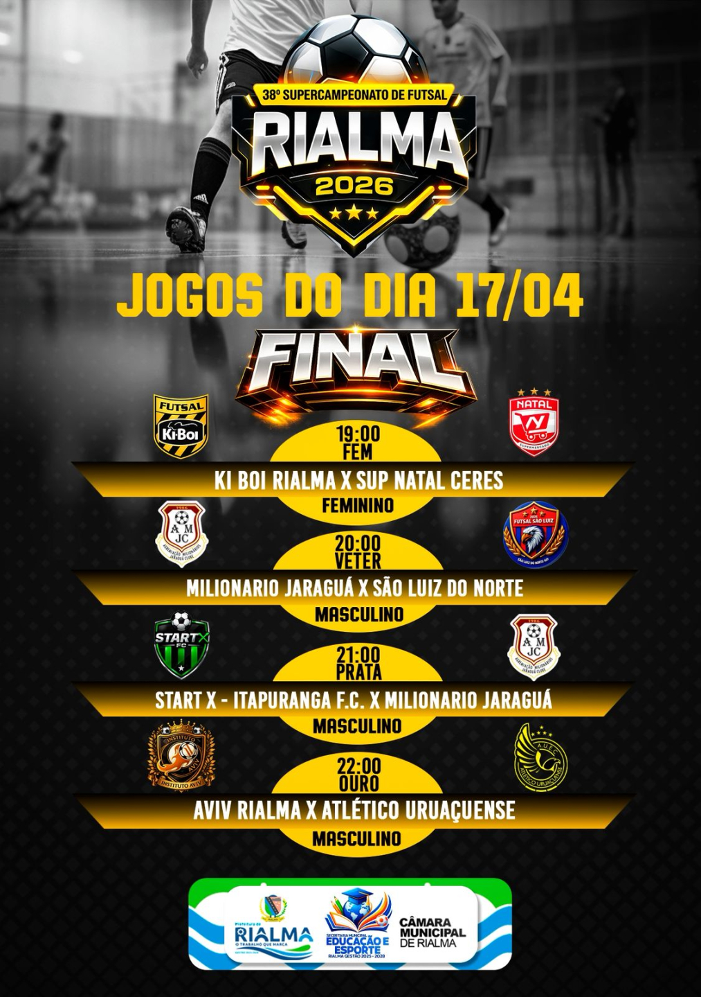 A Prefeitura Municipal, por meio da Secretaria de Educação e Esporte, convida toda a população para um grande espetáculo do futsal: a grande FINAL do 38º Supercampeonato de Futsal de Rialma 2026!