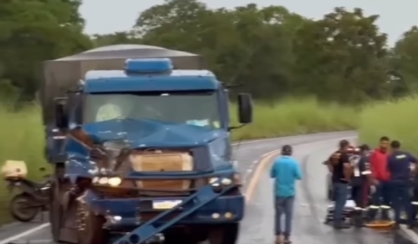 Um grave acidente foi registrado na GO-244, no trecho que dá acesso ao povoado do Estreito, envolvendo uma motocicleta e dois caminhões.