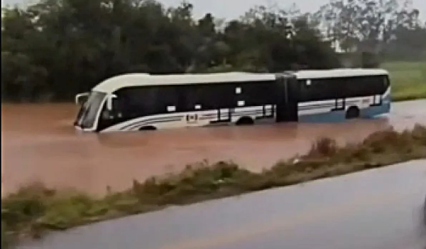 Um ônibus da Linha do Eixo Anhanguera ficou preso em um alagamento ocorrido durante o temporal desta quarta-feira (1º/4) na GO-070, em Goianira. O incidente ocorreu na baixada do Residencial Triunfo II, trecho onde o nível da água impediu o fluxo de veículos e exigiu o resgate dos ocupantes pelo Corpo de Bombeiros Militar (CBMGO).