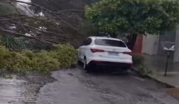 Uma forte chuva atingiu Goianésia na tarde desta terça-feira (14) e provocou a queda de árvores na baixada da Rua 33. Alguns veículos foram atingidos e a via precisou ser totalmente interditada.